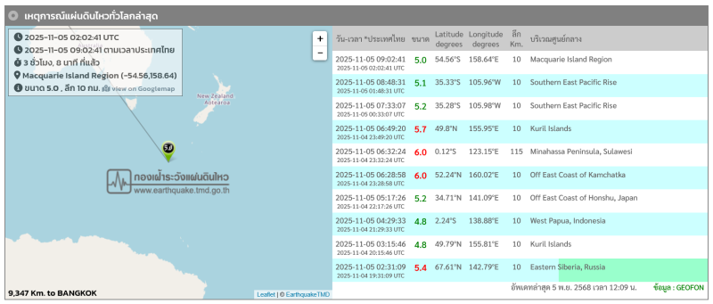 5 พ.ย. 68 เหตุการณ์แผ่นดินไหวภายในประเทศและใกล้เคียงล่าสุด