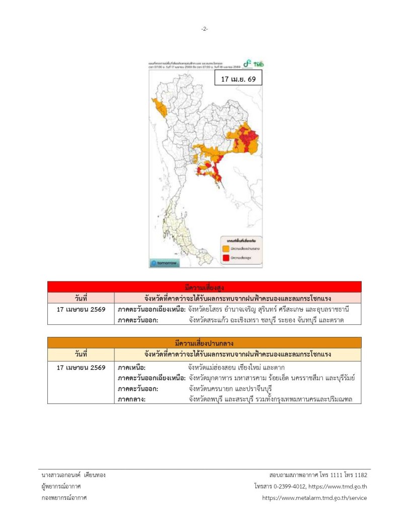 จึงขอให้ประชาชนติดตามประกาศจากกรมอุตุนิยมวิทยาอย่างใกล้ชิด สามารถตรวจสอบข้อมูลเพิ่มเติมได้ทางเว็บไซต์ http://www.tmd.go.th หรือโทรศัพท์ 0-2399-4012-13 และ 1182 ตลอด 24 ชั่วโมง โดยประกาศฉบับถัดไปจะมีการเผยแพร่ในวันที่ 17 เมษายน 2569 เวลา 17.00 น.